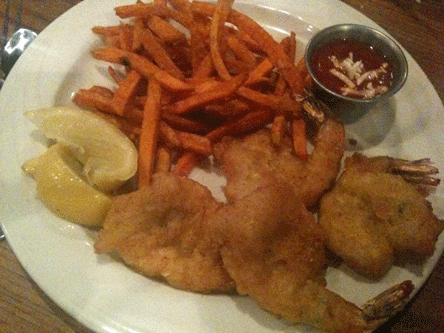 One entree which really works is the Shrimp Pelican which may well be the restaurant’s most popular dish–even though there’s nothing radical or avant-garde about it. Butterflied and golden brown in beer batter, the shrimp are humongous (forgive the oxymoron) and gloriously sweet. Even though my preference is generally for peel-and-eat shrimp with incendiary cocktail sauce, Pelican’s shrimp flood my memories with reminiscences of the first really great battered shrimp I ever had.