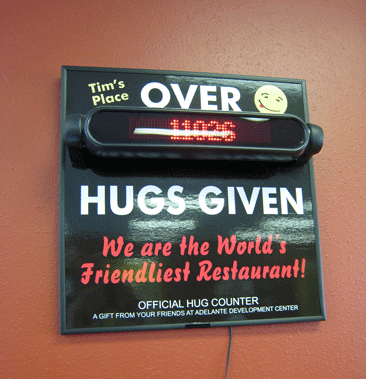 As of June 30, 2011, the date of my inaugural visit, Tim had given more than 11,000 hugs according to the Official Hug Counter hanging on a wall. That’s a lot of therapy! Tim doesn’t charge extra for this life-affirming succor and unlike some credentialed quacks who charge an armload, he consistently gets results. Just look at the beaming faces of loyal patrons who frequent Tim’s Place not only for the excellent food, but for the soothing picker-upper of a tight hug from what may well be the Duke City’s most beloved restaurateur.