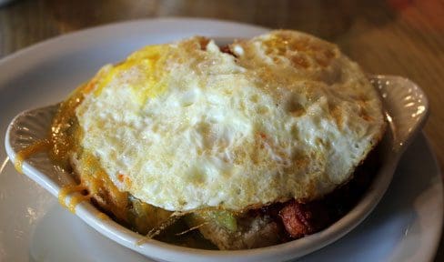 Huevos Yucatecos feature corn tortillas layered with black beans, two eggs any style, green chile, Swiss and feta cheese, pico de gallo, and surrounded with fried bananas. It is served with your choice of beans, posole, or potatoes (ask for all three). It is one of the dishes featured on Diners, Drive-Ins and Dives. It stands to reason that host Guy Fieri would relate to an entree which melds seemingly disparate ingredients. Several years ago Fieri launched Tex Wasabi, a restaurant serving Southwestern barbecue and California-style sushi, as innovative a fusion of disparate cuisine as you’ll find anywhere. Fieri appreciated the Huevos Yucatecos.