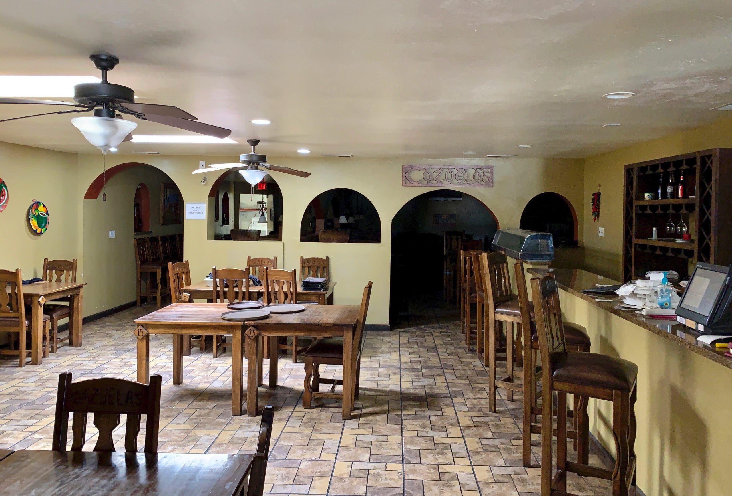 Enter through the north-facing door and you’ll see why the restaurant is named Cazuela’s. A large painting of a casserole dish hangs prominently. There are several Mexican paintings hanging on the restaurant’s walls, all framed in the unique style of Old Mexico. An arched doorway takes you from the front dining room to a more expansive dining room. Several half-moon shaped arches throughout the restaurant give you visibility to a beautiful venue that facilitates tranquil and relaxing dining.