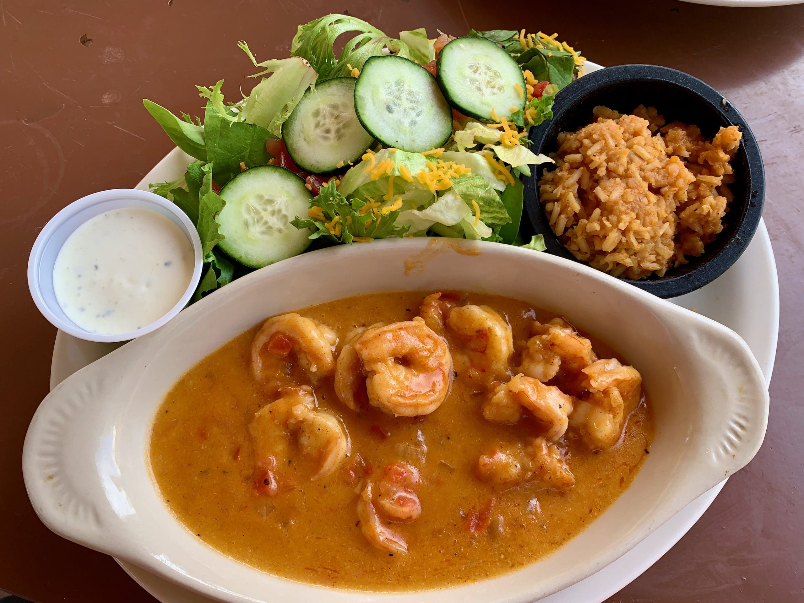 26 December 2015: The Especialidades Marisco (Seafood Specials) section of the menu is brimming with netfuls of fresh, succulent seafood featuring pescado (fish), camarones (shrimp) and pulpo (octopus) entrees. Although seafood isn’t widely thought of as “rich,” with the right sauce, seafood can be made as rich and calorific as virtually any meal. The camarones crema de hongos (whole grilled shrimp in a cream sauce with mushrooms) is one of those almost too rich to finish dishes so good you’ll soldier on despite the sensation of being sated. There’s a wonderful contrast between the earthy, fleshy fungi and the sweet, succulent shrimp you’ll find addictive. This dish is served with a simple salad and your choice of Ranch or Italian dressings.