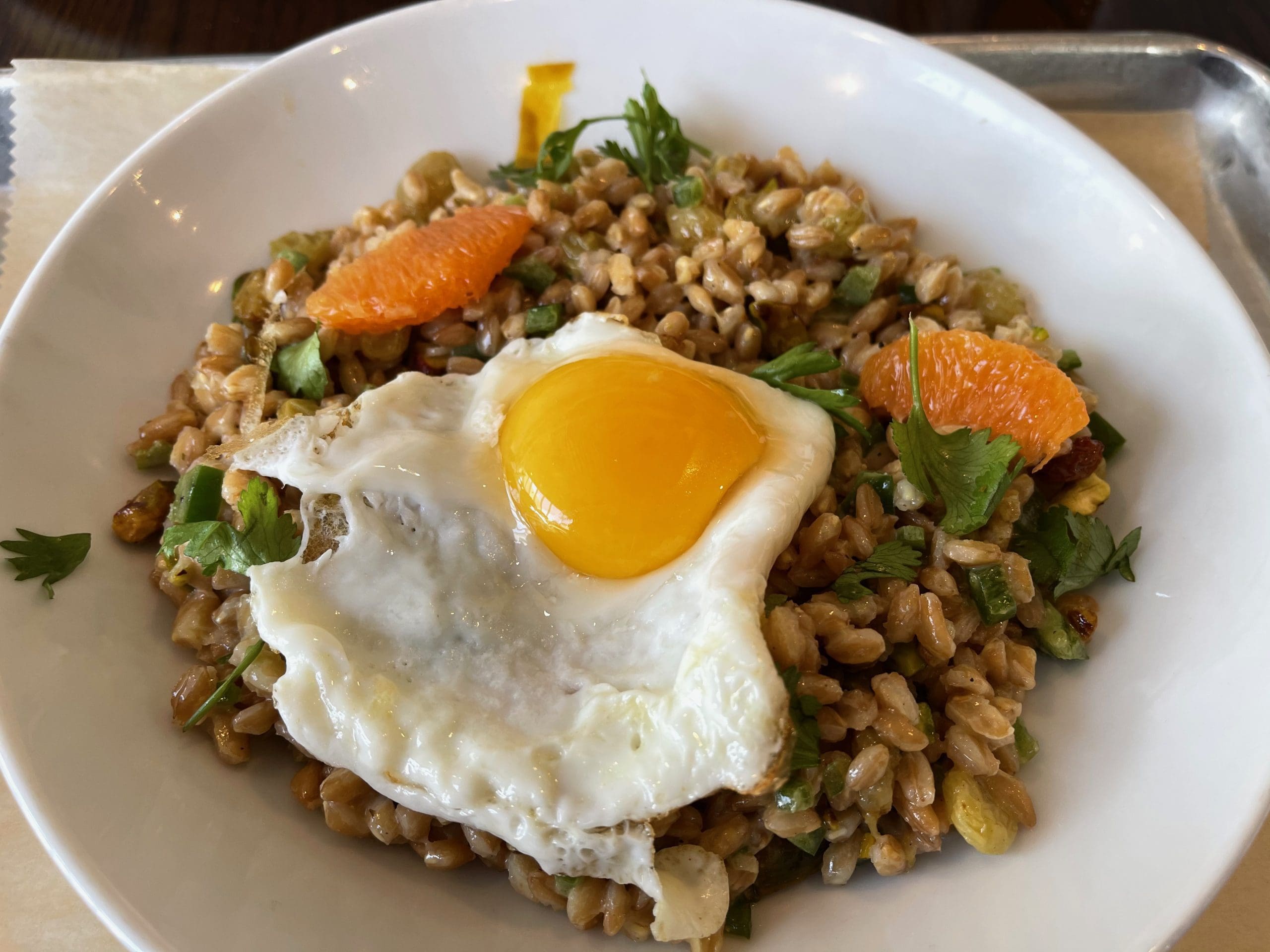 6 June 2021: One of the problems with ordering the brunch special is that you might never again see it offered–especially if you visit The Grove as infrequently as we do (not an indictment of The Grove, but rather a testament to our “polyamorous” relationship with restaurants). Perhaps the most special of the several specials we’ve enjoyed at The Grove is the citrus farro bowl (farro, jalapeño, roasted pistachios, cilantro and parsley, Cara Cara oranges, sweet golden raisins, ginger lemon vinaigrette, topped with a sunny side egg).