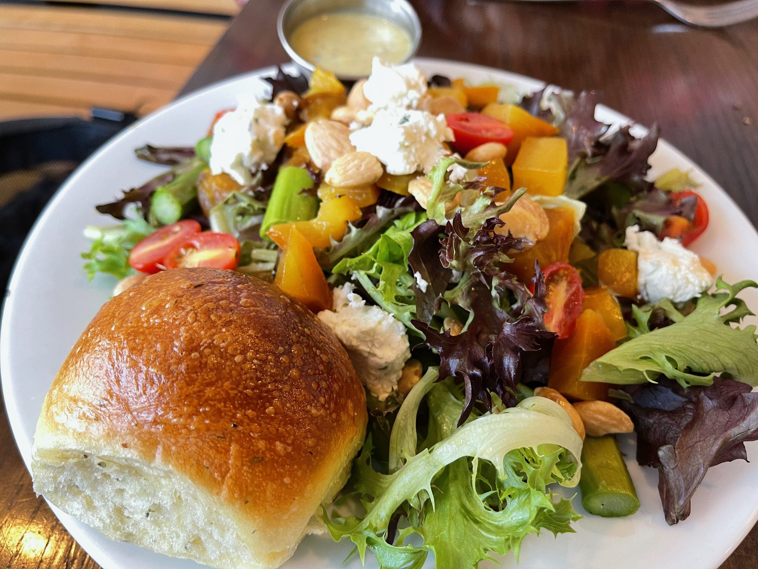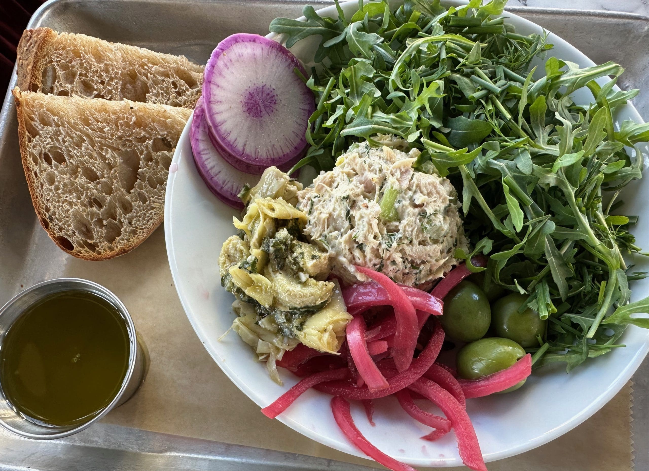 15 February 2024: We’ll also order the Mediterranean tuna salad (albacore tuna salad, marinated artichokes, Castelvetrano olives, pickled red onion, capers, radish, arugula and fresh herbs with champagne vinaigrette) again. Had we attempted such a salad at home we would have used a shovel instead of a scoop. This salad just didn’t have enough tuna. Thankfully it wasn’t bound with an overage of mayonnaise or salad dressing. It was mostly pure, unadulterated tuna, as fresh and delicious as you can find in Albuquerque. The Grove includes two slices of sourdough bread with this salad. Though it may be tempting to construct a tuna sandwich, this salad stands out on its own.