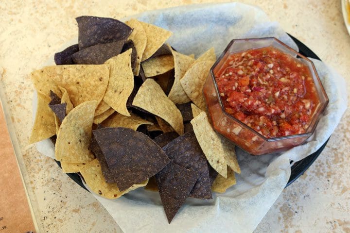 19 July 2017: Regardless of what you order, you’ll want to start your meal with The Bistro’s fabulous chips and salsa (some of the very best in the state). The salsa is made with an autumn-blend chile flecked with roasted red (more like orange) chile. Roasted red chile has a sweeter flavor than roasted green chile, a sweetness we mistakenly attributed to finely diced carrots. The melding of piquancy and sweetness is a pleasant surprise. Another is the generous portion of this terrific starter. Blue- and yellow-corn chips are thick enough to support the weight of any Gil-sized scoop of salsa.
