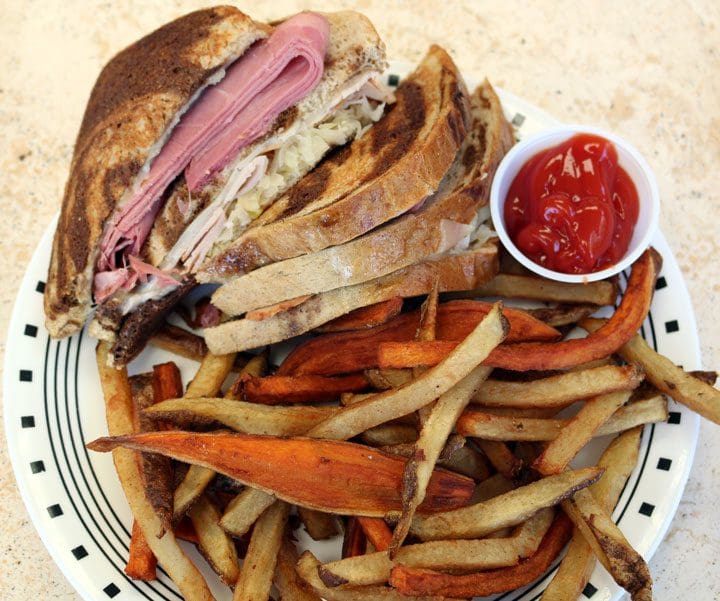 11 August 2007: There are ten sandwiches on the menu, some of which would challenge a competitive eater to finish. Take for example, the Ruben, a grilled triple-decker sandwich skyscraper high with corned beef, turkey, Swiss cheese, mild sauerkraut on lightly grilled rustic rye bread. Russian dressing may be in there somewhere, too, but it’s lightly applied to give the meat the opportunity to shine. Shine it does. This is one of the best Ruben sandwiches in the Duke City area. A propeller-headed mathematician friend of mine with a penchant for French words said it was “an ordre de magnitude” better than others he’s had in town.