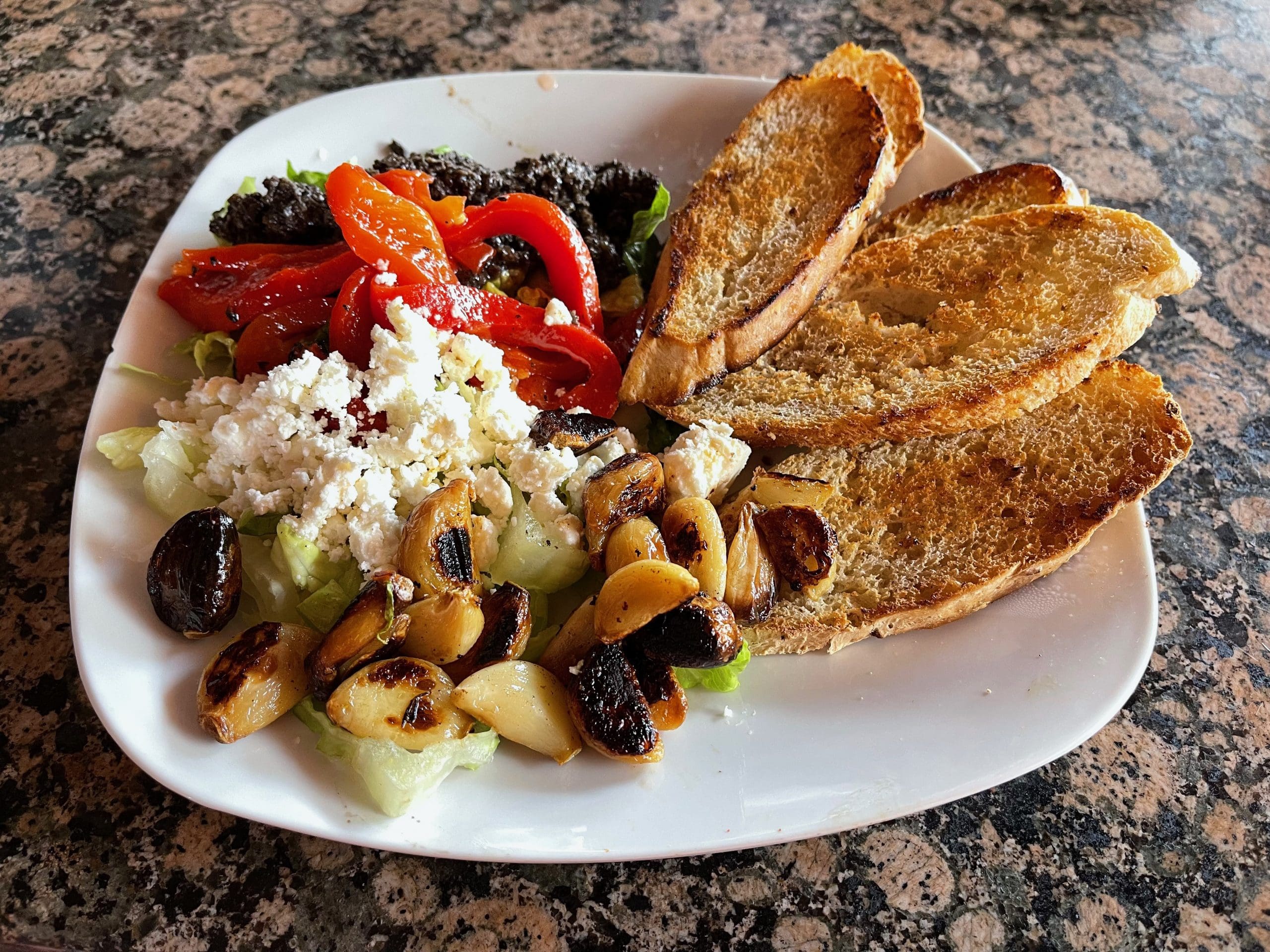 20 June 2021: According to Psychology Today, a group of Czech biologists embarked on an experiment that seems to suggest garlic consumption positively influences body odor. Darn, there goes my argument to my Kim that too much garlic repulses people. You’d think she was trying to ward off a village of vampires the way she enjoys garlic. When she saw the roasted garlic and feta bread dippers (feta cheese, roasted garlic cloves, olive tapenade, Balsamic dipping sauce and toasted bread) on the menu, she just had to have it. She enjoyed the garlic while her devoted husband devoured all the feta cheese (which thankfully does not affect body odor or breath).