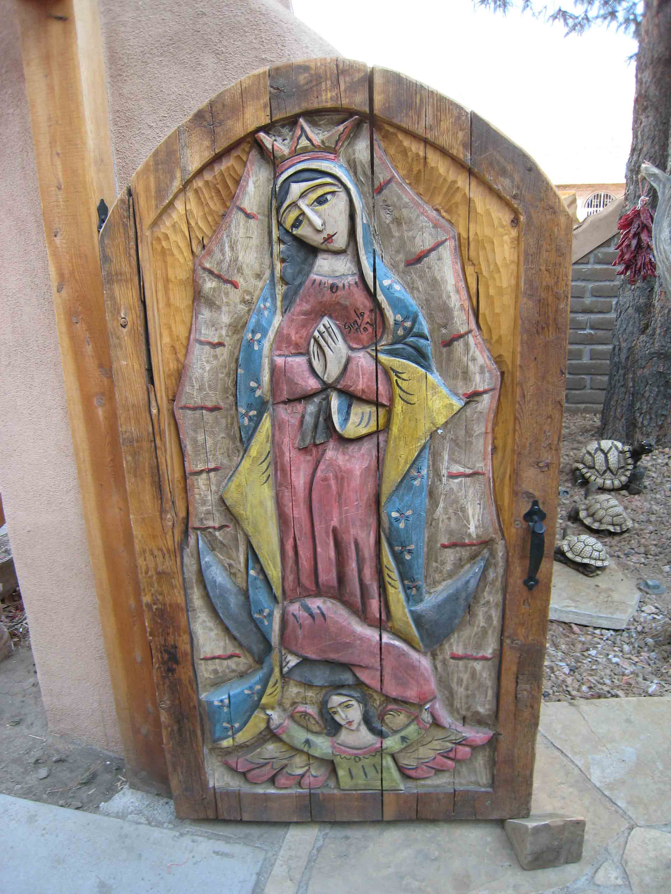 The entrance to El Bruno’s is through a wooden bell gate into an expansive courtyard. A large Spanish bell is poised above the gate as if to call in hungry patrons to a meal with its timbre and tintinnabulation. On the wooden gate is carved the Virgen de Guadalupe, the patron saint of the Americas. To many New Mexicans there is no truer manifestation of welcome.