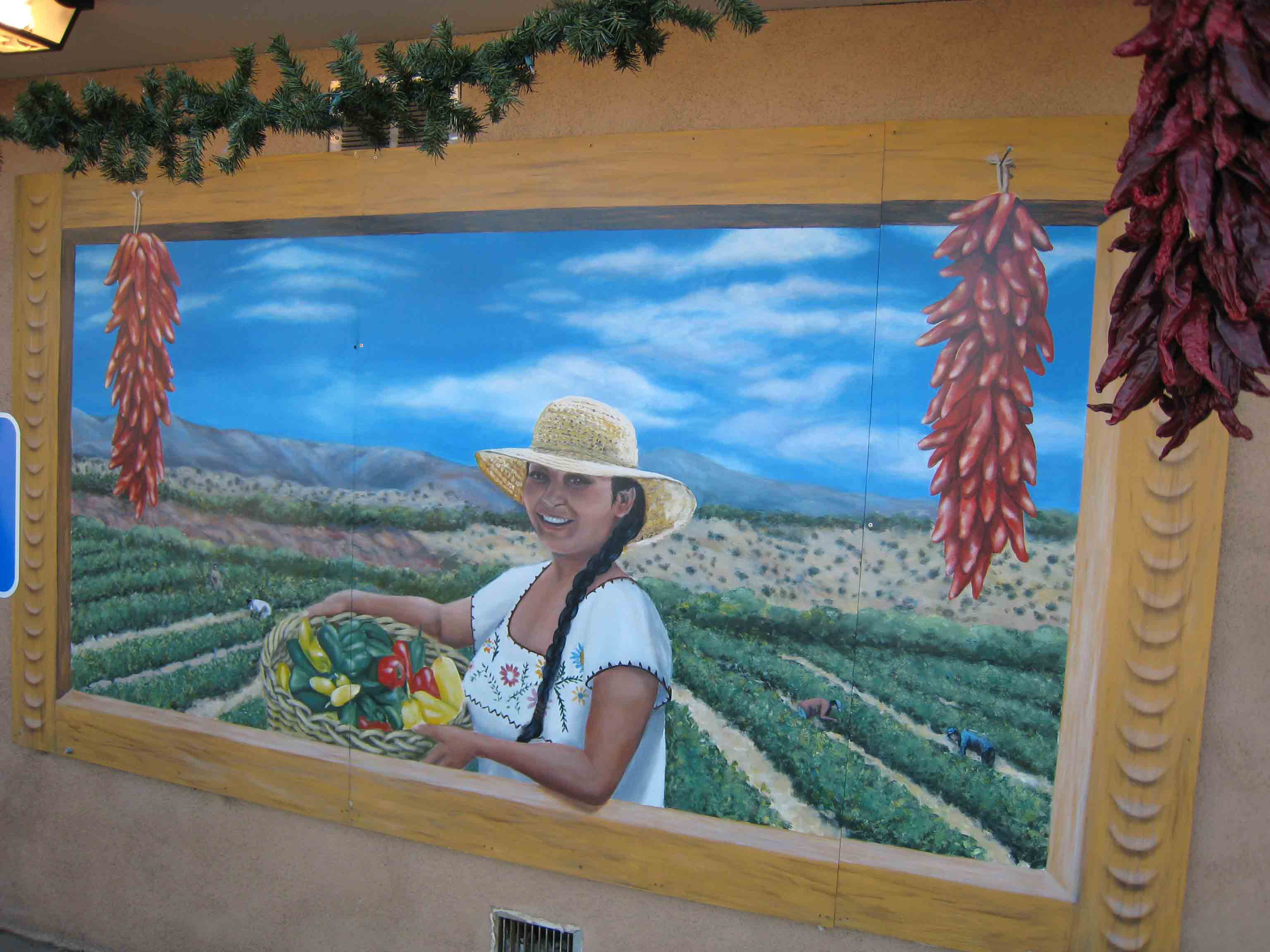 As with its predecessor, the rebuilt El Bruno’s parking lot is expansive. It has to be to accommodate all the hungry patrons, many of whom drive more than an hour just for lunch and dinner. The exterior west wall includes a colorful mural of a New Mexican woman carrying a basket brimming with green, red and yellow chile peppers while other field hands harvest New Mexico’s official state vegetable from fecund and verdant fields.