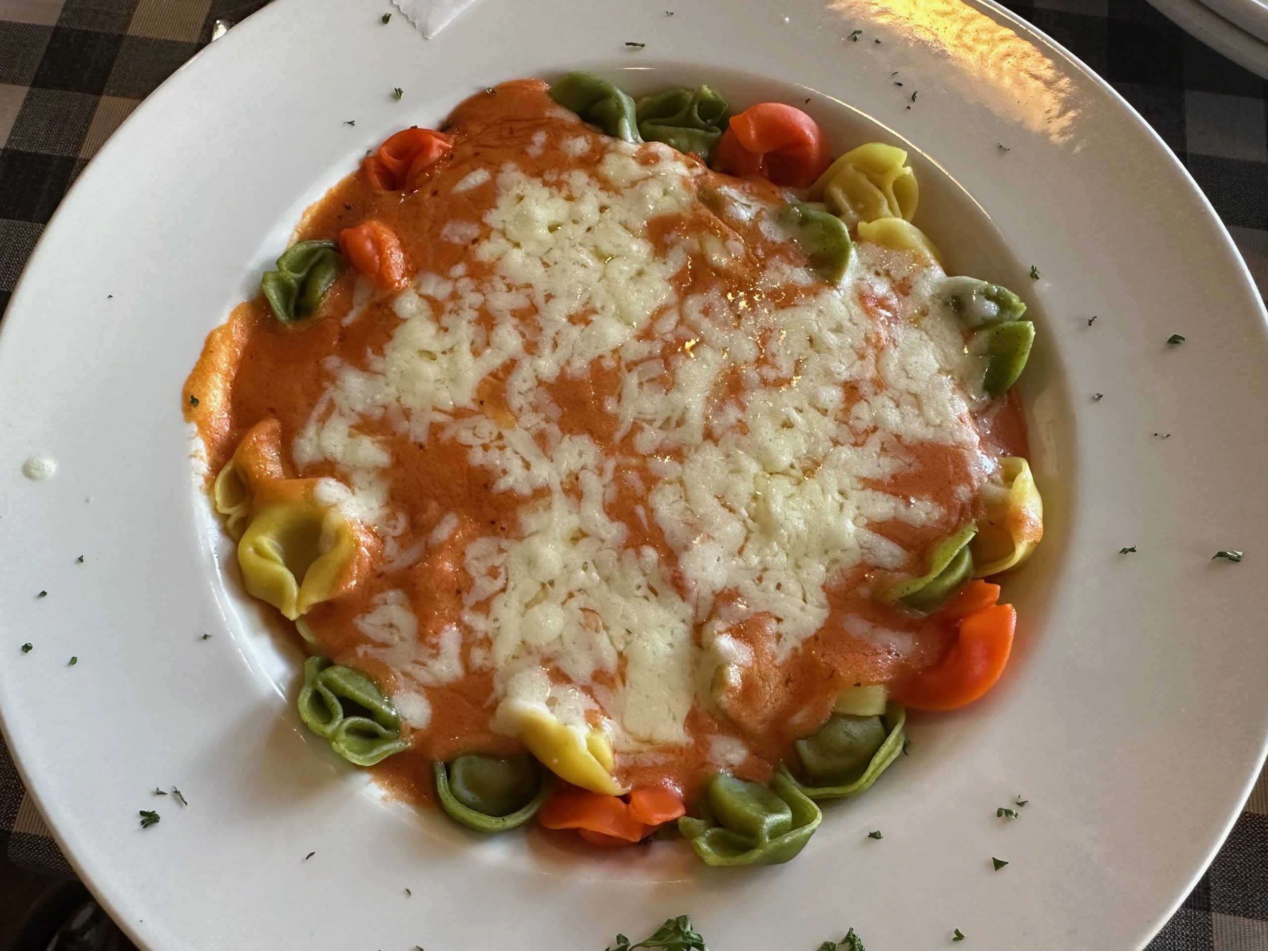 3 September 2023: When it comes to creativity in naming food, you can’t beat Italians. Who but Italians would name a pasta “Priest Strangler” (strozzapreti) and another one “whore’s pasta” (puttanesca)? Italians are adept at naming pasta for body parts, too. There’s Orecchiette (ear) and Tortellini (a woman’s navel) just to name two. Inventor Giuseppe Cerri’s wife or girlfriend must have had an “outie” because that’s what the pasta resembles. Mario’s tortellini (small pasta dumplings filled with ricotta cheese and topped with meat sauce) is the best in town though instead of meat sauce, I recommend the tomato alfredo. This is a very rich dish served in a profligate portion. You’ll certainly be taking some home with you which is just fine because the sauce improves with time. The tortellini are the color of the Italian flag: red, white and green. This tortellini is so good, you’ll want to fly the Italian flag and salute it.