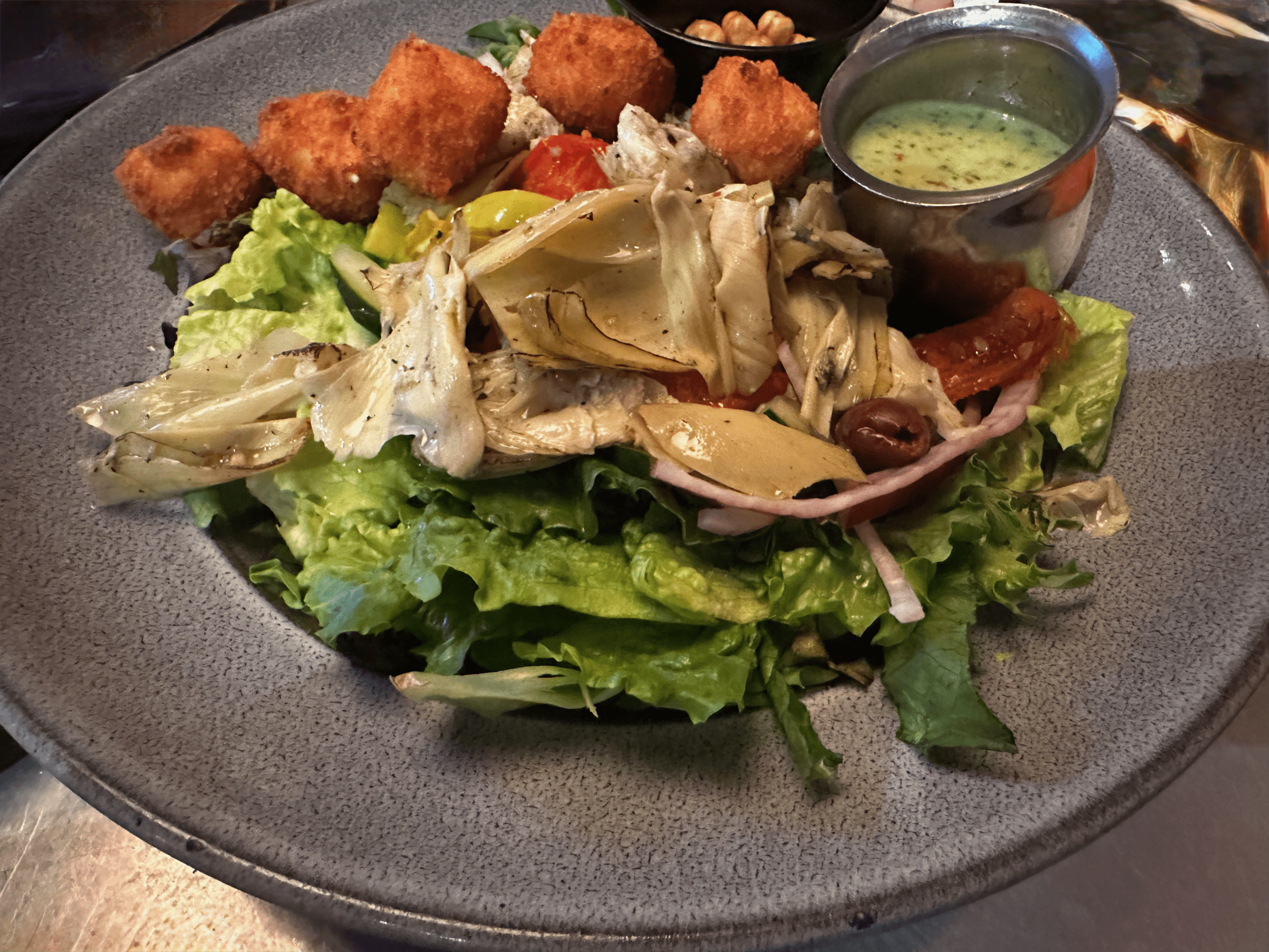 Hitting The Range up on a Sunday night, my Kim was out-of-luck; her first three salad choices being unavailable. Fortunately the Mediterranean Salad (mixed greens, artichoke hearts, roasted tomatoes, kalamata olives, red onions, chickpeas, cucumber, pepperoncini, feta croutons, lemon basil vinaigrette) was far more than a consolation prize. This salad proved more than a sum of its wonderful parts. Every ingredient on the plate worked harmoniously to create an amalgam of flavor. Several elements were noteable–the feta croutons especially. Those croutons were somewhat reminiscent of mozzarella sticks albeit with a delectable feta. My Kim also praised the artichoke hearts and kalamata olives.
