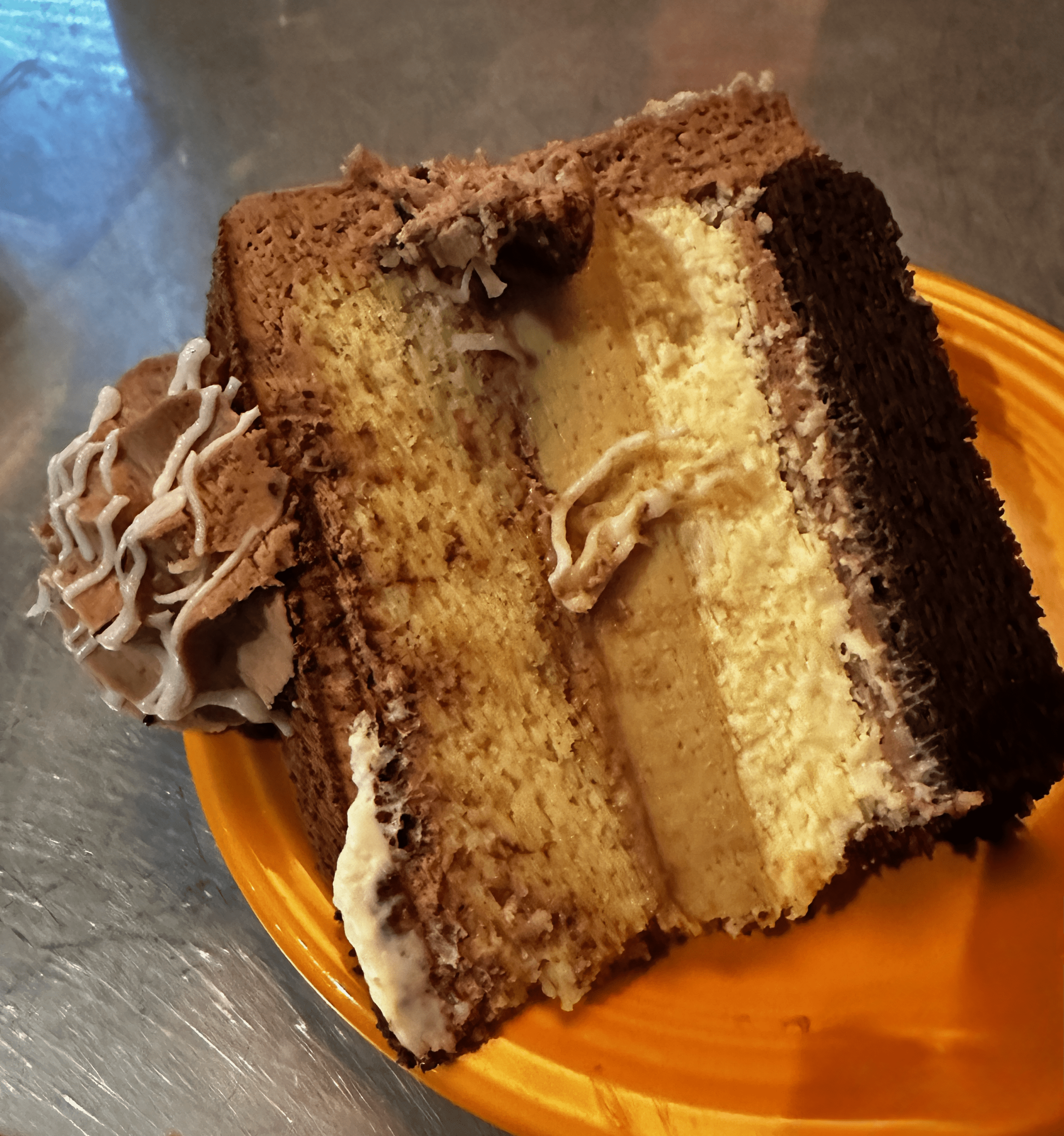 Our new friend Cliff should probably run for mayor of Pie Town. His platform would undoubtedly include a pie in every tin. Cliff didn’t hesitate to order The Range’s green chile apple pie. Even sans ice cream, the pie was wonderful with sweet and tart, juicy and crisp apples providing an interesting and delicious contrast to a green chile that was more piquant (by far) than the green chile enchiladas Cliff had as his entree or the steak enchiladas Mariton enjoyed. There was no chile on my dessert choice, a Mexican latte cake (layers of dark chocolate cake, vanilla bean cheesecake, coffee flan and brandy tres leches topped with chocolate cream cheese whipped cream). It’s as good as promised with so many wonderful contrasting flavors coalescing into a mountainous mound of chocolate deliciousness.