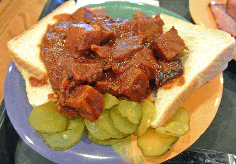 Sandwich is a vast understatement for the enormous mound of beef, pork or “burnt ends” piled onto a half acre (okay, maybe a little overstatement there) of orange wrapping paper (to go orders). By the time that paper is unwrapped, the bread has been rendered virtually incapable of serving as a vehicle for the steamy meaty accompaniment bathed in sauce. The meat is vegetarian conversion glorious in all its manifestations. The beef is better than you’ll find in Texas (forgive me Ryan Scott, but if it’s any consolation, Arthur Bryant did come from Texas), the pork as perfect as ‘cued in Memphis and better than both are “burnt ends,” barbecue beef brisket parts (not scraps mind you) as tender as butter with caramelized edges that seal in flavor. Charred and smoky, the burnt ends are a Kansas City tradition.
