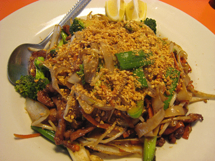 2 January 2011: Barbara’s highest recommendation was for the Phuket Chowfun, sizzling Thai-style noodles with ground peanuts, a dish she admired for its unique fusion qualities. This dish showcases tangles of wide Chinese rice noodles stir-fried with white and green onions, broccoli florets and other vegetables. The dish is available with pork, beef or chicken. Barbara advises squeezing lemon onto the dish which has the effect of providing a surprisingly fun and tasty contrast to what is a well balanced combination of sweet and savory flavors. This is definitely one of the very best Chow Fun dishes we’ve had in the Duke City.