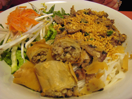 2 January 2011: Vietnamese vermicelli noodle dishes are a healthful and tasty way to enjoy another well-balanced combination of flavors. This entree is layered with shredded lettuce, bean sprouts, pickled carrots, grilled pork and chopped egg rolls, all topped with finely crushed peanuts The star of the dish is the grilled pork which is imbued with the unique smoky, sweet flavor imparted by the grill. You’ll want to saturate this dish with the Asian Grill’s fish sauce, a pungent, sweet, savory and piquant sauce.