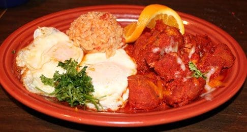 Enchiladas and tacos occupy an entire page on the menu. Shrimp and crab enchiladas (topped with chile con queso and fresh green chile) are just one of the six different enchilada offerings, all of which can be made with blue corn tortillas. Platos de pollo (plates showcasing chicken), de la parillada y del mar (from the grill or the sea) and fajitas y carnitas share a page on the menu. The other two sections of the menu showcase Antojitos Mexicana and Platos de Combinacion on one page and burritos, chimichangas, los burgers and “para los niños” on another. The menu is replete with surprises, some items of which you won’t see at other New Mexican restaurants in Albuquerque.