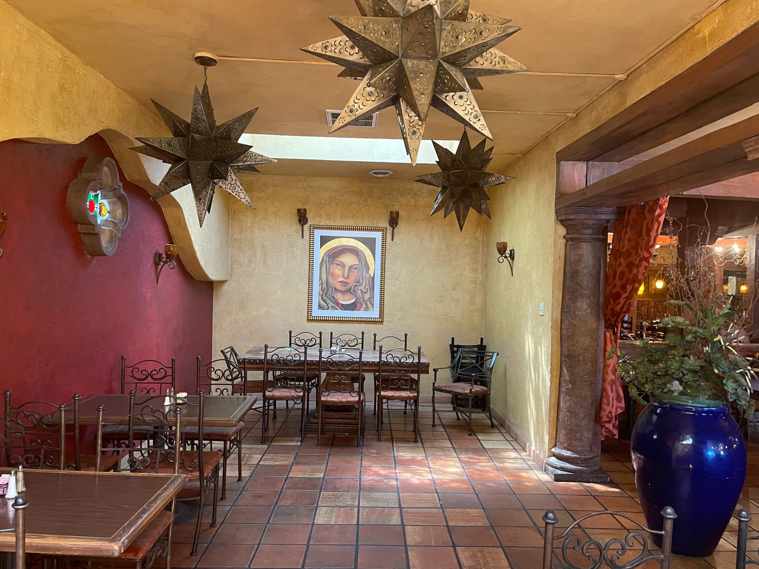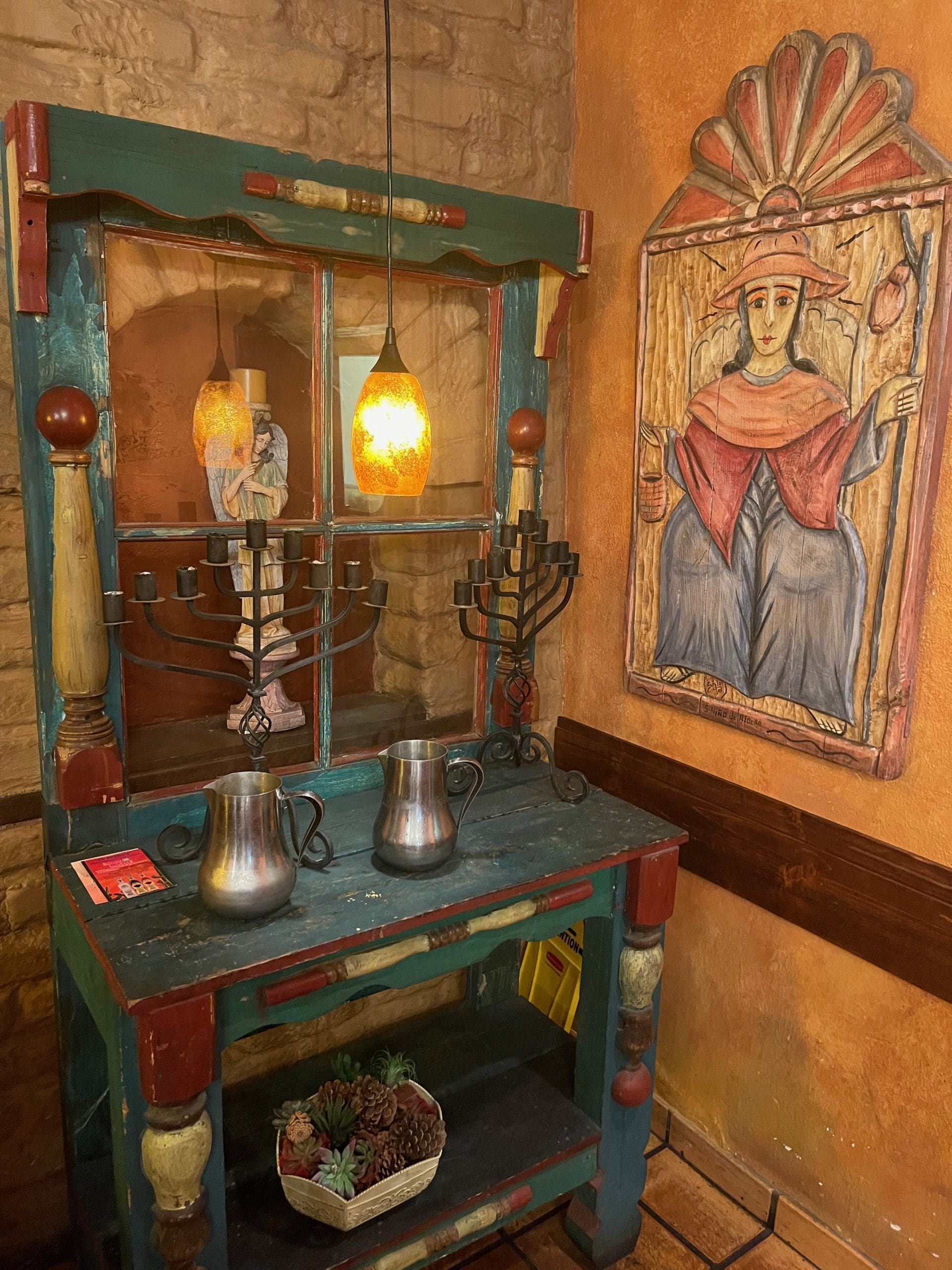 There’s plenty to see on the premises of El Bruno, too. A colorful mural on an exterior west wall depicts a New Mexican woman carrying a basket brimming with green, red and yellow chile peppers while other field hands harvest New Mexico’s official state vegetable from fecund and verdant fields. The entrance to El Bruno’s is through a wooden bell gate into an expansive courtyard. A large Spanish bell is poised above the gate as if to call in hungry patrons to a meal with its timbre and tintinnabulation. On the wooden gate is carved the Virgen de Guadalupe, the patron saint of the Americas. To many New Mexicans there is no truer manifestation of welcome.