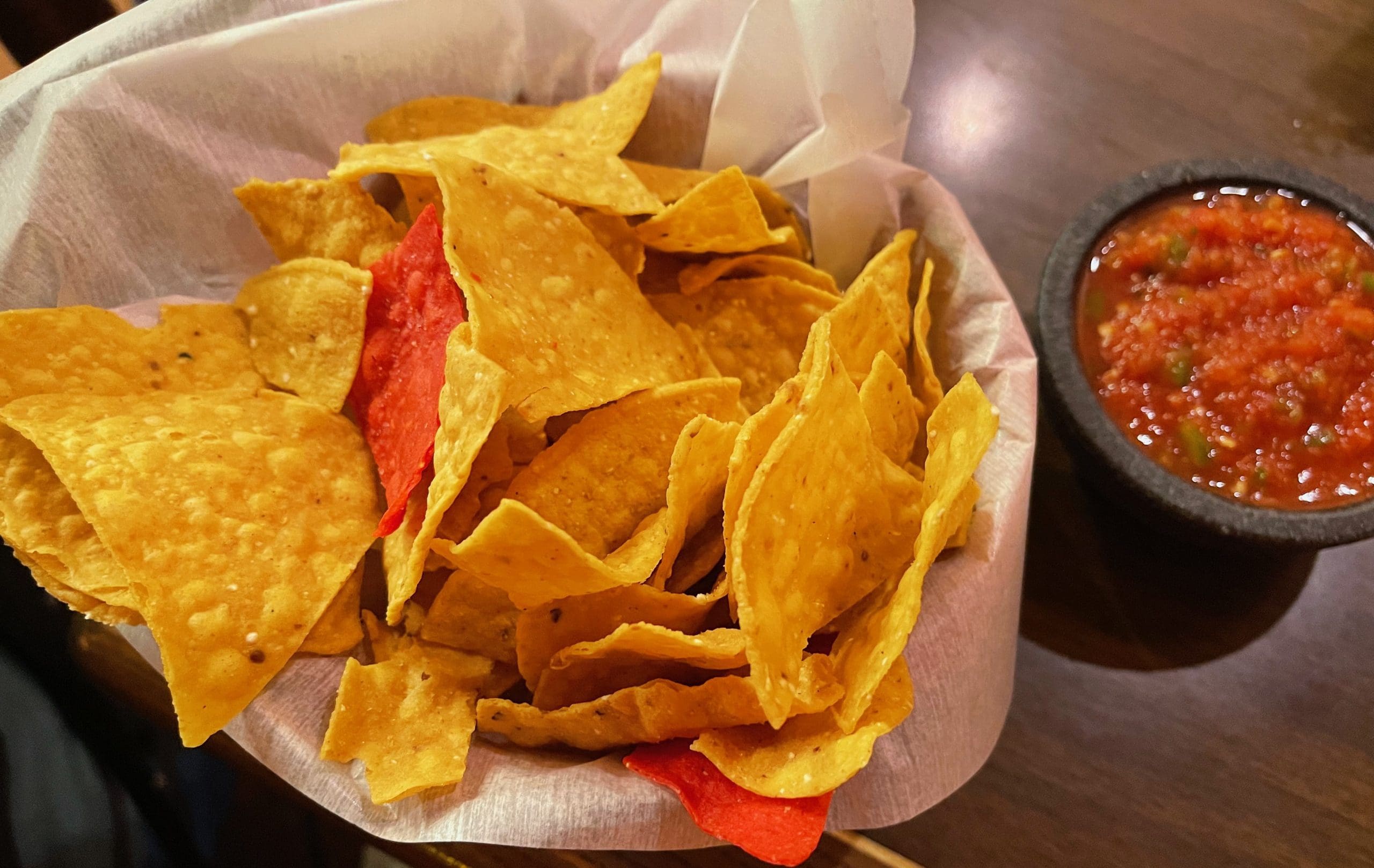 The red chile salsa was fire hot, too hot for my wife but in small quantities I found it good by the third or fourth dip with chip.
