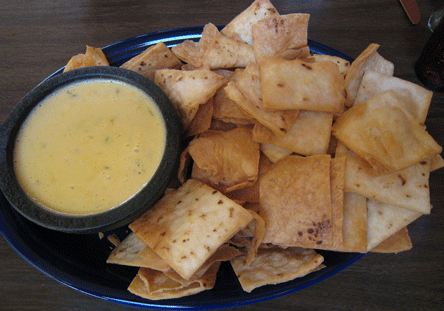 13 March 2011: Alas, one of our very favorite dishes in Cuba, the magnificent chile con queso, was a disappointment in Albuquerque. In fact, it was downright “dumbed down,” lacking the piquancy the Cuban con queso contained. Though the queso was flecked with green (ostensibly green chile), it was as punchless as the University of New Mexico football team under coach Locksley. Without piquancy, the queso was reminiscent of the gloppy Velveeta genre. Instead of conventional chips, El Bruno’s con queso is served with crispy tostadas (fried flour tortillas). These “chips” are magnificent!