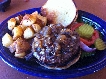 16 March 2011: The “Los Burgers” menu features six half-pound burgers, including one served on a tortilla with green chile. Just as it’s not every great Italian restaurant that can make a decent pizza, not every great New Mexican restaurant can char-grill a decent burger. My frequent dining compañero and amigo especial Bill Resnik and I arrived at that conclusion after a couple of bites each of our burgers, both of which arrived at medium-well though we requested medium-rare and medium respectively. Mine was a Chaco Burger which is embellished with blue cheese crumbles, caramelized onions and chipotle mayo. The combination of caramelized onions and chipotle mayo is very sweet (much like a caramelized onion relish) and there weren’t enough blue cheese crumbles to provide any contrast (and I like my blue cheese breath-wrecking strong). If there was any bite to the chipotle, it, too, was obfuscated by the sweet caramelized onions.