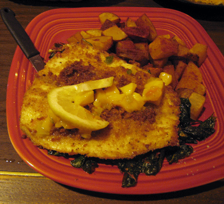 4 December 2011: Thanks to a recommendation from the professor of the perspicacious palate Larry McGoldrick–or more accurately, his better half Jane who became besotted of an entree showcasing rainbow trout, my own opinion may have been forever changed. El Bruno’s piñon crusted rainbow trout is butterflied and pan-seared to a golden-hue then topped with a mango salsa–not enough to make the trout “fruity tasting,” but just enough to provide a light contrast to the delicate, fresh taste of the trout. The piñon crust is also delicate with barely a hint of the woodsy tasting nut. The trout is served atop a bed of fried spinach, a unique dish first created by the brilliant entrepreneur Tom Hamilton of the sublime Hamilton Chop House (sadly now closed) outside Durango. It’s served with a generous mound of red chile-dusted papitas and a garden salad (make sure you request the green chile ranch dressing).