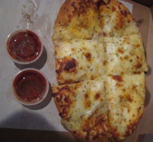 Anyway, the cheese bread is, well…cheesy. Melted to a perfect consistency (so it’s neither stringy or oily), the cheese and bread combination are best right out of the oven when hot. Unable to finish all six slices, we tried the next day to eat the cheese bread cold and were disappointed. The cheese bread is served with your choice of pizza dipping sauce or Ranch dressing. We found the pizza dipping sauce, not that it was needed when the pizza was hot, over-salted. A good substitute is Catalina dressing, a sweeter rendition of French dressing. The sweetness of the Catalina is a flavorful contrast and complement to the cheese.