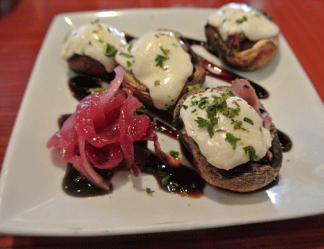 You might opt instead for an appetizer of Prosciutto Stuffed Crimini Mushrooms, four mushroom caps engorged with prosciutto covered with melted mozzarella and drizzled with truffle oil. It’s served with sweet picked red onions and aged balsamic vinegar. The crimini mushrooms are meaty and moist, a perfect repository for the slightly salty prosciutto. The aged balsamic vinegar and its sweet tanginess provides a nice counterbalance to the savory strengths of the mushrooms and prosciutto.