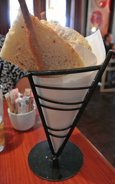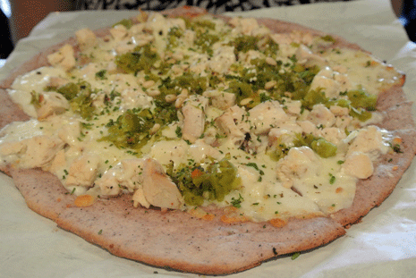 I almost always build my own pizza, but what the heck, yesterday I tried Rooftop’s award winning pizza: the pizza with chicken, green chile, cotija and asadero cheeses and pinons with (an exceptional) blue corn crust. It was sort of like a pizza-quesadilla and I did like it a lot.