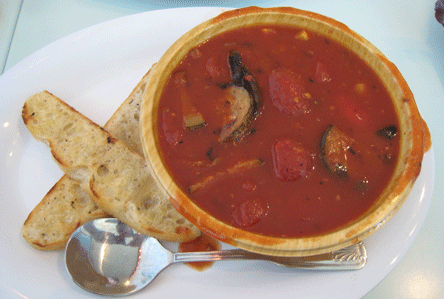During all my visits to San Francisco, one of America’s truly great culinary hotbeds, the one dish I absolutely have to partake of is cioppino, a fish stew whose genesis is indeed the City by the Bay. In Albuquerque cioppino is almost as rare as hanging ten on the Rio Grande so approximations have to make do. Bailey’s offers a seafood stew described on the menu as “seafood, grilled veggies and onions in Bailey’s Cabernet Bouillabaisse.” Jacques Cousteau would have been challenged to find more than a few small clams in the piping-hot stew, the star of which is the herb and spice enriched Cabernet and tomato-based sauce which has a nice bite worthy of V8. The seafood stew is served with grilled ciabatta bread.