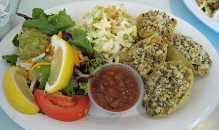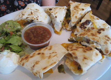 Perhaps named for the beach attire that draws men to the beach, the Mostly Naked Quesadillas are a surprisingly good rendition, the likes of which you’re not likely to find on the Santa Monica Pier. Naked, in this case, might also have to do with the fact that these quesadillas are rather simple–Cheddar and Jack cheeses rolled in a flour tortilla with a double-roasted green chile that packs a punch. The quesadillas are cut into wedges and served with sides of guacamole, sour cream and salsa. You can dress up these cheesy delights with chicken, steak, mahi mahi and veggies which can be prepared in any of three ways: grilled, marinated or blackened.