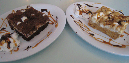 Bailey’s on the Beach offers a number of desserts though our choices–mudslide madness (dark chocolate truffle brownie topped with marshmallows, roasted almonds and hot fudge) and Bailey’s Beach Blondie (butterscotch brownie topped with marshmallows and toasted walnuts doused with Bailey’s caramel fudge)–were cloying with a level of sweetness which would have made children ping off the walls. More apropos for the beach would have been the tropical key lime pie or Italian ice.