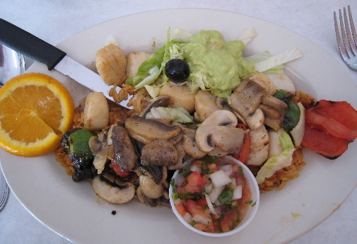 Seafood lovers will salute the camarones (shrimp) or scallops banderillas which are served with grilled bell peppers. onion, tomato and smothered with sauteed mushrooms on a bed of rice. This is a dish warranting a salute or two. For one thing, Dahlia’s uses real scallops, not the imitation scallops some restaurants serve. Prepared in wine butter, the scallops are a perfect blend of sweet and savory flavors that coalesce beautifully. The vegetables are all grilled to absolute perfection. The sauteed mushrooms impart their fungi flavor onto the rice, making it moist and flavorful.