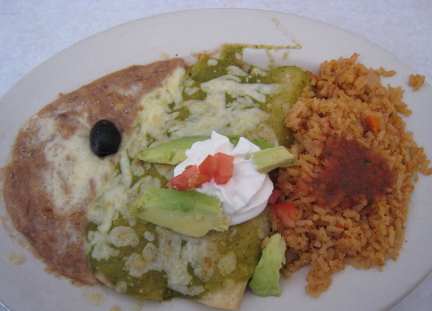 Enchiladas Suizas are among the richest and most delicate in Mexico. Dahlia’s version features rolled enchiladas topped with a green cream-based sauce topped with avocado and sour cream and imbued with the distinctive hint of lime. These enchiladas are not piquant in the least, but they are very flavorful and delicious. They are served with rice and beans.