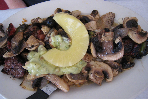 Still another mouth-watering entree involves camarones (shrimp) wrapped in bacon and served with a cheesy rice, a grilled pineapple slice and a tangy, smoky barbecue sauce. The shrimp is kissed with the flame of a well seasoned grill and has a faint smokiness. The bacon is fried just enough so that it wraps completely around the shrimp. The barbecue sauce is a surprising complement to the sweetness of the shrimp.