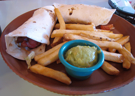 The menu features four sandwiches including the Cantina Wrap: bacon, chopped chile, cheese, lettuce and tomatoes rolled in a warm flour tortilla with a side of guacamole and French fries. There might be a full two rashers of thick, smoky bacon in this sandwich. The bacon and green chile definitely steal the show. Only a thicker, more substantial tortilla could improve this sandwich.