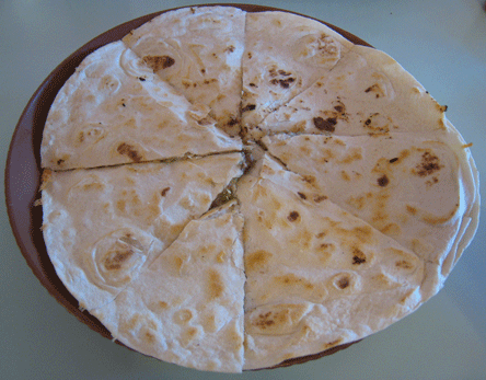 The quesadilla, two large flour tortillas stuffed with Jack cheese and green chile along with your choice of ground beef or chicken, showcases green chile that does indeed have an attitude. It’s pleasantly piquant with a nice roasted flavor and aroma and there’s plenty of it. There’s more green chile, in fact, than there is ground beef. The ground beef is freshly fried, not refried as some restaurants tend to do. It’s also seasoned nicely and complements the green chile very well. If you’re tired of “designer” quesadillas with sundry ingredients, this is a “back to basics” quesadilla with memorable qualities.