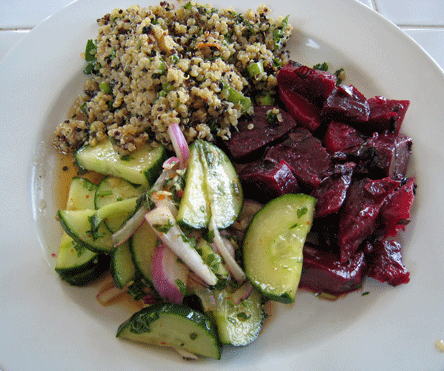 An acre of land behind the restaurant provides Real Food Nation with salad ingredients of unimpeachable quality and freshness. The greens and vegetables are grown using biodynamic principles and irrigated, to the extent possible, with captured rainwater. The results are absolutely delicious. The best way to experience this freshness is with an assorted three salad plate. The triumvirate of terrific salads my Kim and I shared were an Organic Colorado Quinoa salad (with edamame, scallion and cilantro dressed with a sesame tamari dressing), Organic Roasted Beets (with a sherry orange vinaigrette) and a Cucumber Salad (red onion, cilantro and mint dressed with a ginger-sweet chile dressing). The only way this entree could have been improved is had we ordered a six salad plate. Every salad is absolutely delicious and impeccably fresh. Served on the same large plate, they will ultimately coalesce, but the resultant ingredient blend is just as delicious as each salad is separately.