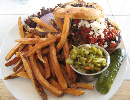 If you’re not in a green chile cheeseburger mood (rare though that may be), Real Food Nation has a burger unlike any you’ll find at most restaurants. It’s a local lamb burger made with Merguez spices and served with fries. Merguez are Algerian and Tunisian sausages made with lamb then spiced with harissa (a hot chile sauce), cilantro and a spice blend from which I was able to discern caraway and cumin. The flavors are quite intense–not necessarily piquant, but well-spiced. The burger is topped with feta cheese and roasted red peppers which add fuel to an already fiery burger. This burger is not for everyone, but if you appreciate intense flavors, it will knock your socks off.