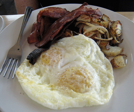 At the opposite spectrum, but no less delicious, is an entree of two eggs, home fries and heritage bacon. The eggs are sourced from Beneficial Farms, a local purveyor of chemical free, sustainable farming products. The differences are discernible and they’re delicious. The heritage bacon is terrific–crisp and definitely not cured using injected brine as the bacon tends to be at fast food restaurants. It’s bacon as it should be.