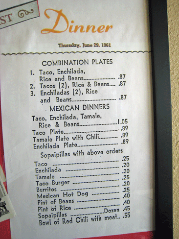 Taco Sal’s is no longer owned by the Gabaldon family, but new owners seem to have continued Sal’s tradition of hospitality (though, unfortunately not the price structure depicted in the menu above). Not only does the terrific aroma of simmering green chile greet you as you step through the front door, you might even get a “hi, doll” greeting from one of the friendly wait staff. Taco Sal’s is a restaurant frequented by regulars, some of whom have been visiting for decades. The friendliness is just one of the reasons.