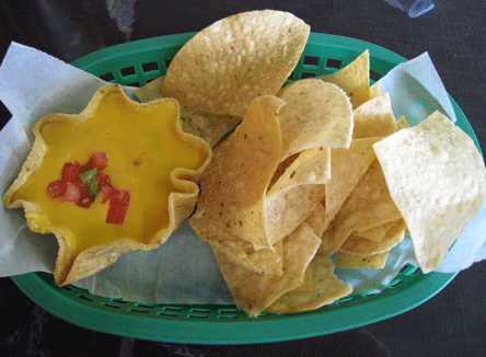 9 June 2011: Another reason is the con queso which is served in a bowl constructed of the same corn from which the chips are made which means its edible, too. Although the con queso looks like the gloppy processed cheese served at sporting arenas, it’s much better both in consistency and especially in flavor. The con queso packs a discernible punch–maybe not enough to water your eyes, but enough for you to know there’s chile in there. The chips are relatively low in salt and are formidable enough for large scoops of con queso or salsa.