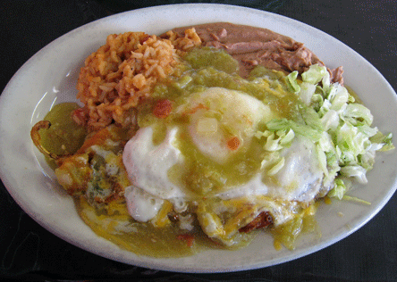 9 June 2011: Two Hatch chiles are stuffed with Cheddar cheese then deep-fried to a crispy consistency and topped with your choice of red or green chile. Green chile on green chile is a good choice. Top it with a fried egg for good measure and a nice contrast between piquancy and the richness of a perfectly fried egg over easy. The chile is about medium on the piquancy scale which is pretty good considering the chile at some restaurants barely registers on the taste buds. It’s a flavorful chile with an even better fragrance. The refried beans and Spanish rice are both good.