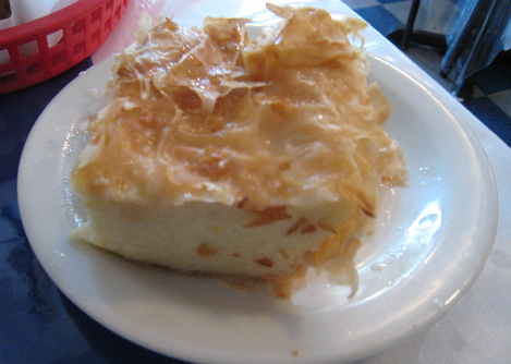 If you have any room left over, dessert options abound. My favorite Greek dessert even though I’m still not able to pronounce it is Galatoboureko, baked custard between crisp phyllo topped with a light honeyed syrup. The custard is rich and delicious but not at all cloying. Galatoboureko is a Cypriot delicacy and one of the best desserts anywhere.