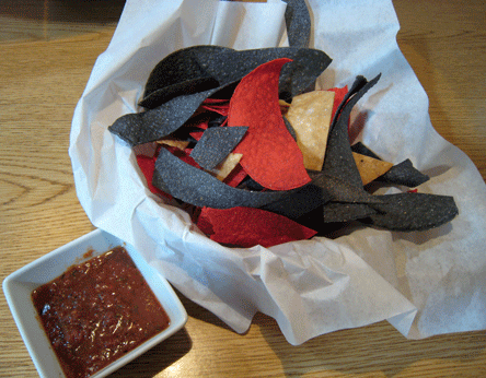4 Aces doesn’t exactly resemble the stereotype most have of restaurants which showcase New Mexican, Mexican and American culinary traditions. It’s very contemporary with exposed ductwork ceilings, tiled floors and bar and an expansive patio. The walls are festooned with art–fairly monotone framed “words of wisdom” on the day of our inaugural visit, but with the promise for more colorful art rotating on a regular basis. Seating is well-spaced with booths hugging the walls and comfortable chairs encircling round tables elsewhere.