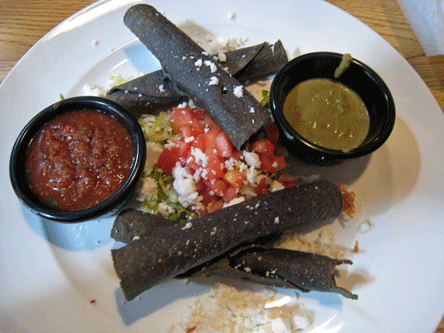 Ryan’s spot-on assessment of most moles is that chefs tend to be rather heavy-handed in preparing them. As a result he’s not met a mole he’s enjoyed. The 4 Aces mole is the dark greenish color of guacamole gone bad, but it has the flavor of mole elevated to the level of sublime. As with most moles in which chocolate is an ingredient, the chocolate is rather subdued, serving a complementary role to breads, spices and nuts in perfect proportions for maximum flavor. A small “salad” (queso fresco, lettuce, chopped tomato) is served on the plate with the taquitos.