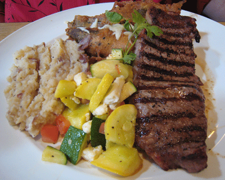 The “main” menu is offered during both lunch and dinner. Only eight items, not counting daily specials, are featured. Of those, only one (blue corn enchiladas) might be considered truly New Mexican though New Mexican ingredients such as blue corn are showcased on other items. The menu also includes two steak entrees including a New York Strip and chile rellenos plate served with two sides. The New York Strip is nicely seasoned, all twelve tender and juicy ounces of it. The chile rellenos are thickly encrusted with a blue corn and sesame batter. Cut into the crust and you’re treated to poblanos engorged with gooey, melted cheese. The blue corn batter makes these special.