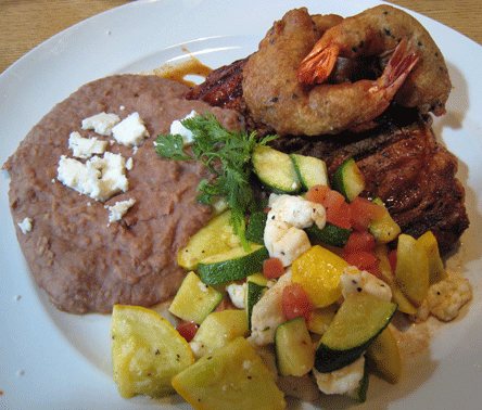 BEST BET: Salsa and Chips, Chicken Taquitos with Chocolate Pasticcio Mole, New York Strip with Two Chiles Relleno, Calabasitas and Garlic Mashed Potatoes, Surf and Turf: Ribeye Steak, Blue Corn and Sesame Battered Jumbo Shrimp, Calabasitas and Refried Beans, Mango and Lemon Sorbet, Flourless Red Chile Chocolate Torte,