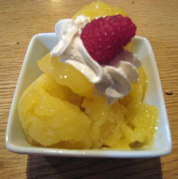 Another Chef Paniagua specialty is sorbet, the palate-cleansing, refreshing and flavor-packed fruity variety. The mango sorbet has a pronounced fresh mango flavor and a velvety soft texture that includes crystalline bits. Too much sugar makes sorbet too soft. The right amount gives it the combination of soft and icy crystal texture I like.