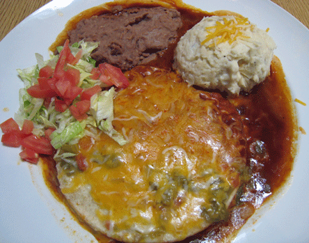 The main entrees are served with two sides. Those include calabasitas, refried beans, poblano rice and garlic mashed potatoes. The calabasitas caught the fancy of Break the Chain blogger Cheri Frost whose “big guy” liked them a little too much. It’s easy to see why. These calabasitas are terrific–crisp, moist, buttery and seasoned to perfection. The refried beans have that familiar cooked with lard taste. Make sure to ask for red chile with which to top the refried beans. The chile, probably from the Sandia pepper, is terrific!