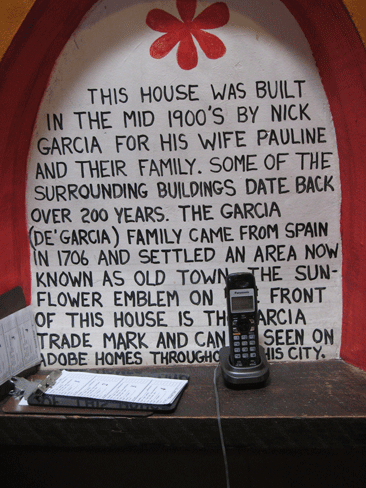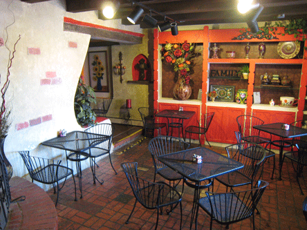 The restaurant is housed in a home built by Nick Garcia in the 1900s. Several homey familial touches remain including trasteros in which family treasures are proudly displayed. Spanish architectural touches abound including deep nichos in which santos are honored. Stately vigas lend an air of stability belied by the creaky floors overhead on the second floor. Brick flooring on the front dining room lends period authenticity while faux wood laminate flooring with a distressed wood look and feel in the back dining room could fool non-experts like me.
