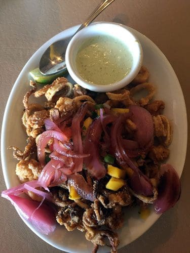 22 October 2015: For many New Mexicans the term “chicharron” conjures images of deep-fried cubes of crispy pork cracklings. We enjoy them in much the way other people eat popcorn. In parts of Texas and Mexico, chicharrones are more akin to menudo or strips of wiggly, squiggly pork tripe. Only in Peruvian restaurants in San Francisco and Las Vegas had we previously seen chicharrones fashioned from seafood (mariscos). Leave it to Elvis to introduce Albuquerque to this uniquely delicious entree. The combination of crispy mixed seafood (African white fish and calamari), pickled vegetables and small mango cubes is a winner, elevated to rarefied air with a habanero tartar sauce so good and so bold and assertive, you may just ask for a second ramekin.